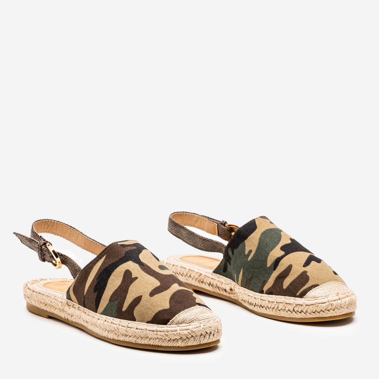 - Extremely comfortable espadrilles made of camouflage fabric. Stripe made of ecological suede, decorated with an animal motif. Fabric covered sockliner. The sole and the tip of the shoe are finished with a braided jute cord.