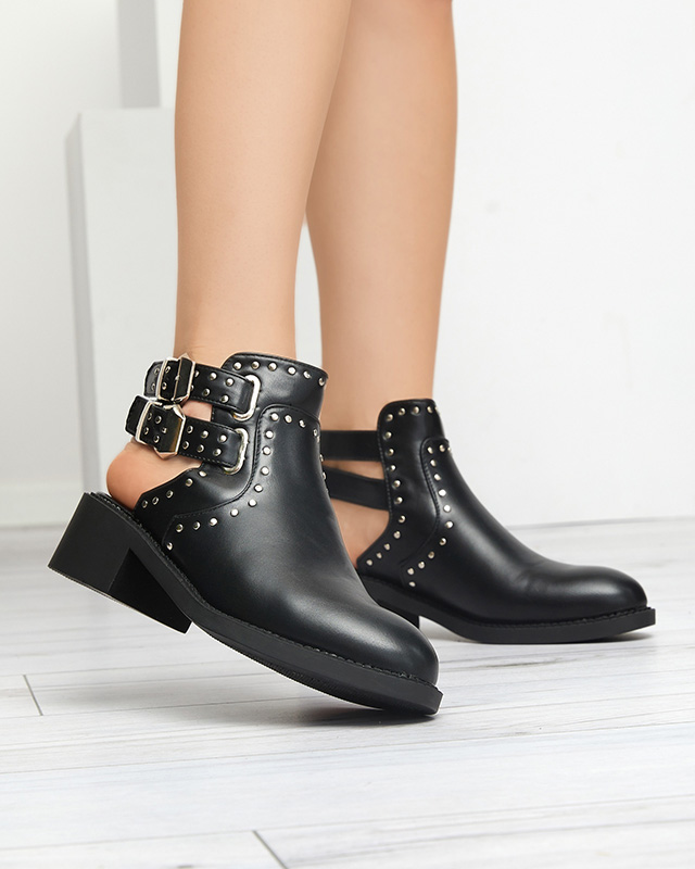 • Black women's boots with cutouts made of ecological leather. Model on a low heel, fastened with buckles at the back. The upper decorated with silver rhinestones. Perfect addition to leather jacket and dress!