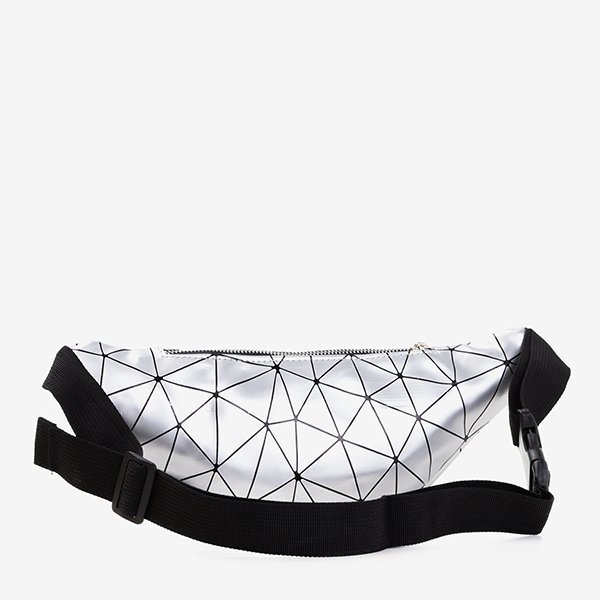 - Small kidney bag made of ecological leather. The material is finished with a decorative geometric pattern. The model has one main compartment and 1 smaller pocket. Adjustable strap with snap buckle closure.