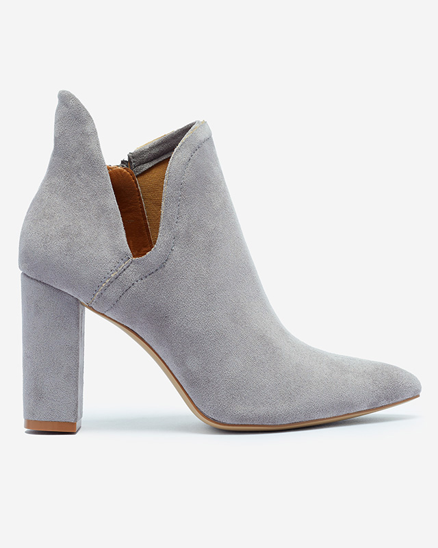 - Sensational gray high-heeled ankle boots. The upper is made of soft eco-suede, and the insole is covered with fabric. The tip of the nose makes the legs look slimmer. The model is fastened with a zipper on the inside.