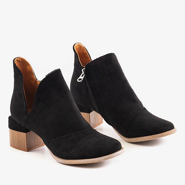 - Fashionable women's ankle boots with cutouts on the low post. The upper is made of eco-suede in black, and the insole is covered with fabric. The model is fastened with a zipper on the inside. Perfectly blend in with any everyday styling!