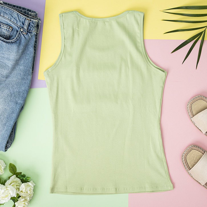 - Basic tasteful women's basic tank top made of cotton fabric. The model on the front is decorated with an inscription made of zircon and pearls. NOTE: Measurement accuracy (+/-) 1 cm. Dimensions measured flat.