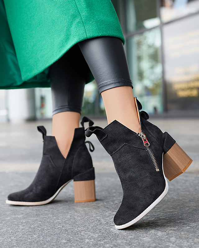 - Exceptional women's boots on a post with a round toe. The material of construction is eco-suede leather, inside eco-leather insole. The upper is fastened with a zipper and has cutouts on the side. Perfect footwear for creating fashionable and original out