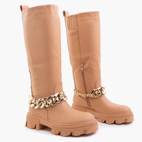 - Classic women's knee-high boots, made of ecological leather. At the height of the ankle, the model is decorated with a detachable strap with a plastic chain in gold color. The boots are zippered, insulated inside in the form of soft fur.