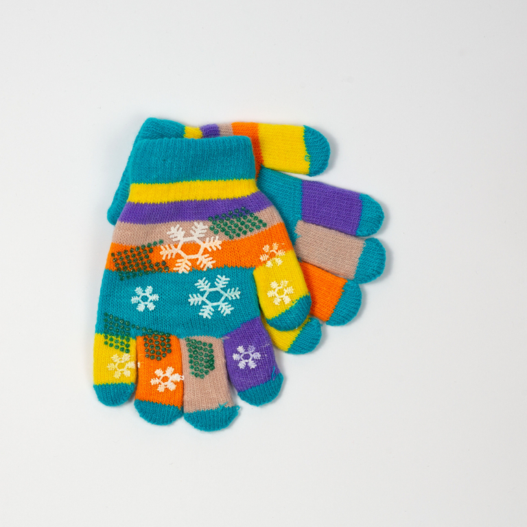 - Girls' gloves made of soft, pleasant material! Model decorated with glitter, colorful inserts and print of snowflakes. Perfect for walks on colder days!