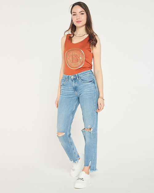 - Women's top with straps made of elastic material. Gold print on the front. Round neckline. NOTE: Measurement accuracy (+/-) 1 cm.