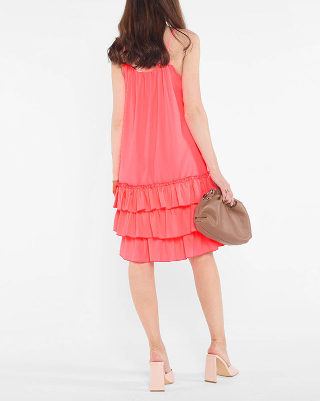 Pink neon women's dress on straps with frills - Clothing