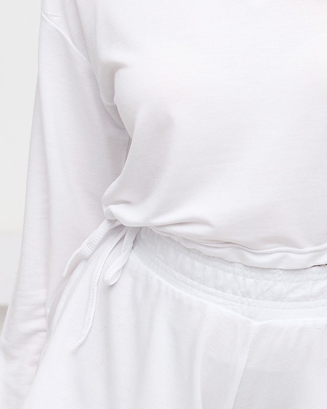 - Comfortable women's sports set made of cotton fabric. The crop top has long sleeves finished with welts and adjustable drawstrings at the waist. The shorts are equipped with an elastic waistband. NOTE: Measurement accuracy (+/-) 1 cm.