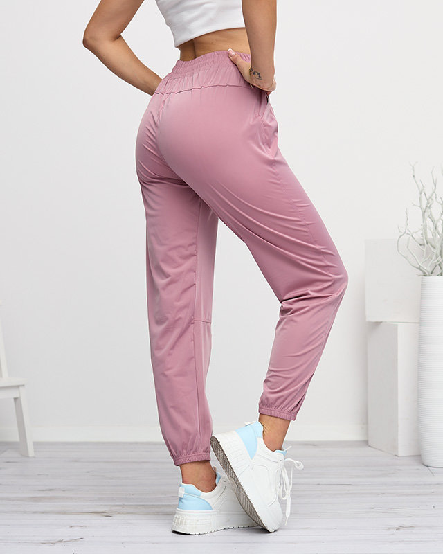 - Women's joggers, made of slightly translucent, slippery fabric. Model with two slip pockets, tied strings and a wide elastic waistband, the legs are finished with an elastic band. NOTE: Measurement accuracy (+/-) 1 cm.