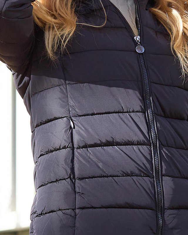 Navy blue women's quilted jacket with hood and fur- Clothing