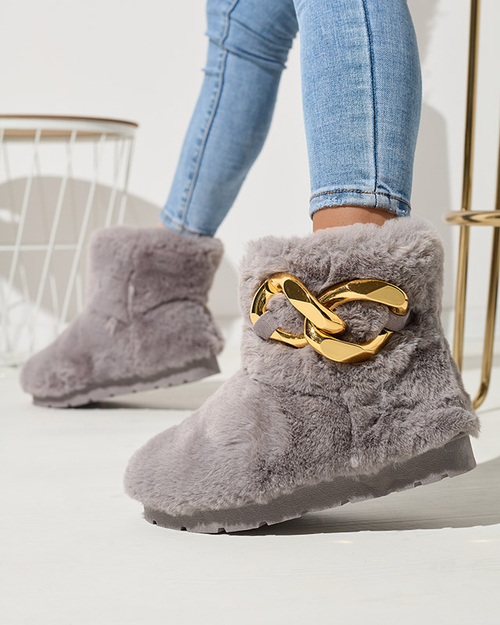 • Stylish women's snow boots on a flat sole. Model made entirely of synthetic material a'a fur. The inside is also insulated with fur. On the side of the golden decoration. Ideal for winter walks! GRAY WOMEN'S INSULATED SNOW BOOTS SATTOPA