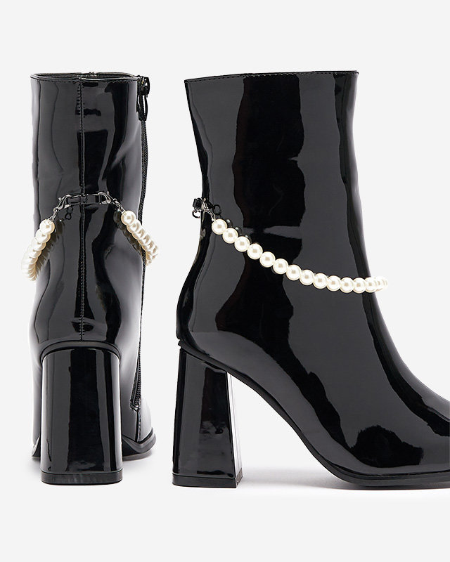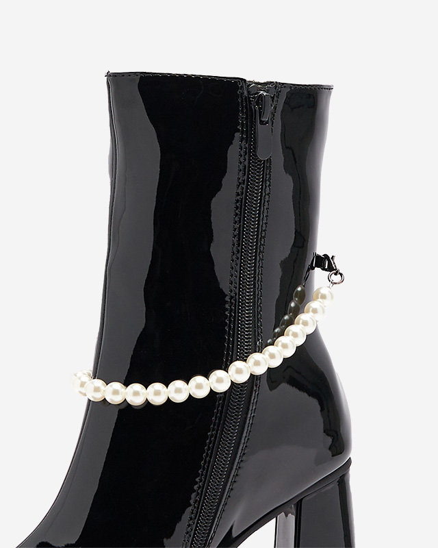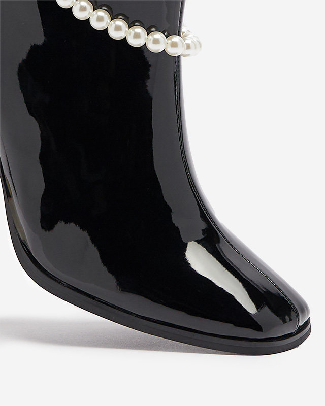 - Women's high stiletto boots, model made of lacquered eco leather. Zippered upper, center filled with soft fur. In addition, detachable decoration on the upper. BLACK INSULATED BOOTS FOR WOMEN RASSLA