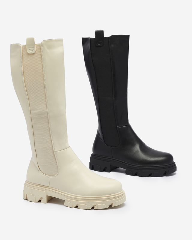 - Classic women's low-heeled boots, made of ecological leather. The model is zippered, there is no warming inside, an elastic insert on the side. CREAM WOMEN'S BOOTS BOOTS UNINSULATED VEBISSA