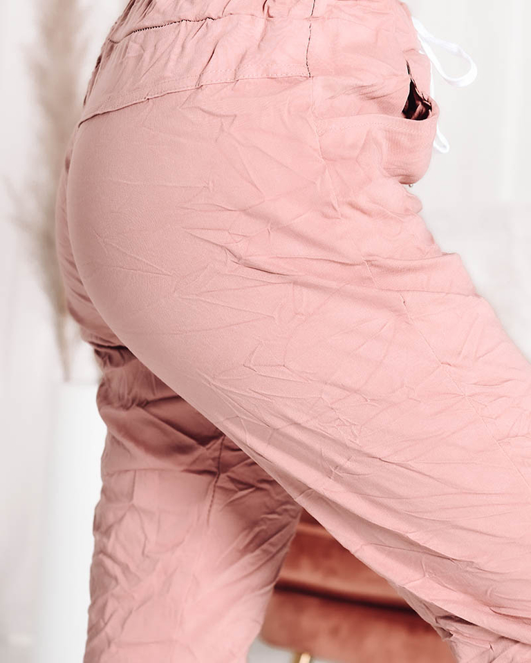 - Versatile women's fabric pants with straight legs. The model has an elastic waistband and trousers. On the sides pockets. A great addition to summer styling!