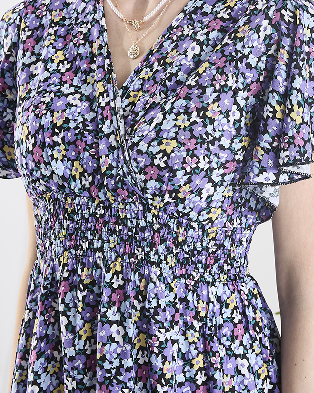 - Women's long dress, made of lightweight, fabric finished with a floral pattern. The model with short sleeves, has an envelope neckline and a wide elastic waistband. A perfect base for many summer outfits! NOTE: Measurement accuracy (+/-) 1 cm.