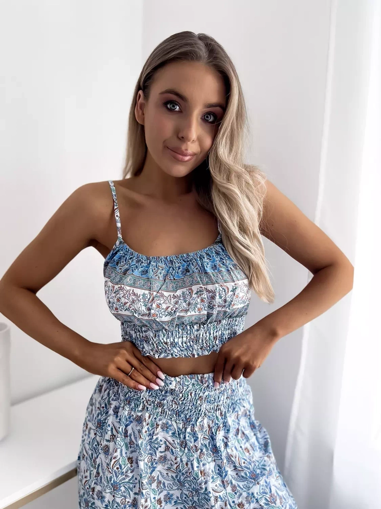- Unique women's set, made of pleasant cotton fabric. The short top has adjustable shoulder straps and an elastic waistband. The fabric pants also have a wide elastic at the waist and at the end of the legs. NOTE: Measurement accuracy (+/-) 1 cm.