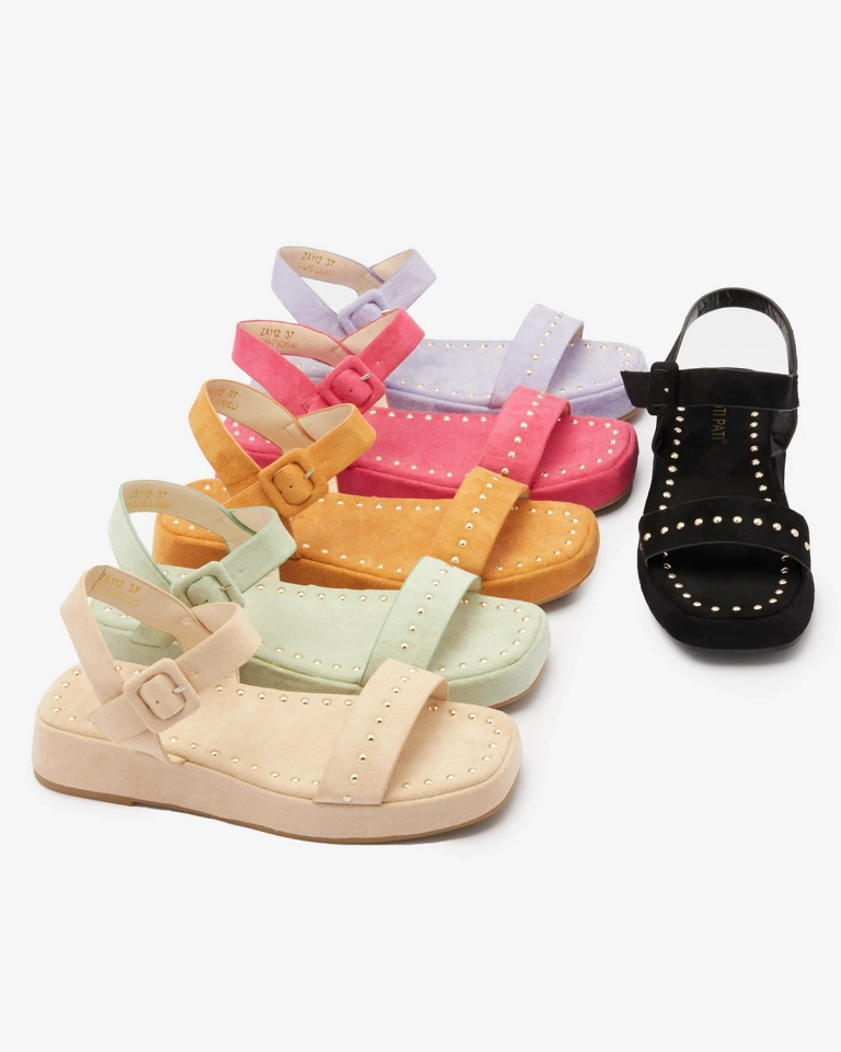 - Women's sandals on a thick sole, made of organic suede leather. Model decorated with rhinestones, fastened with a buckle. Comfortable women's footwear for summer!