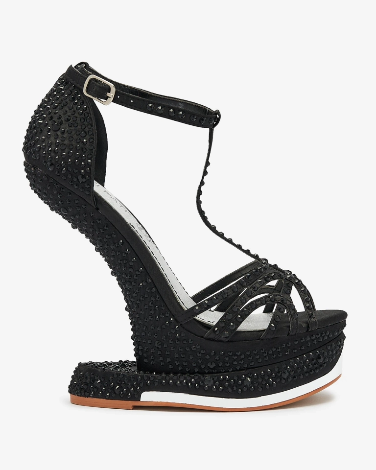 • Unique women's pumps made of fabric, insole made of natural leather. The model is decorated with zircons, has a platform and a hidden high heel. The shoes are fastened with a buckle around the ankle.
