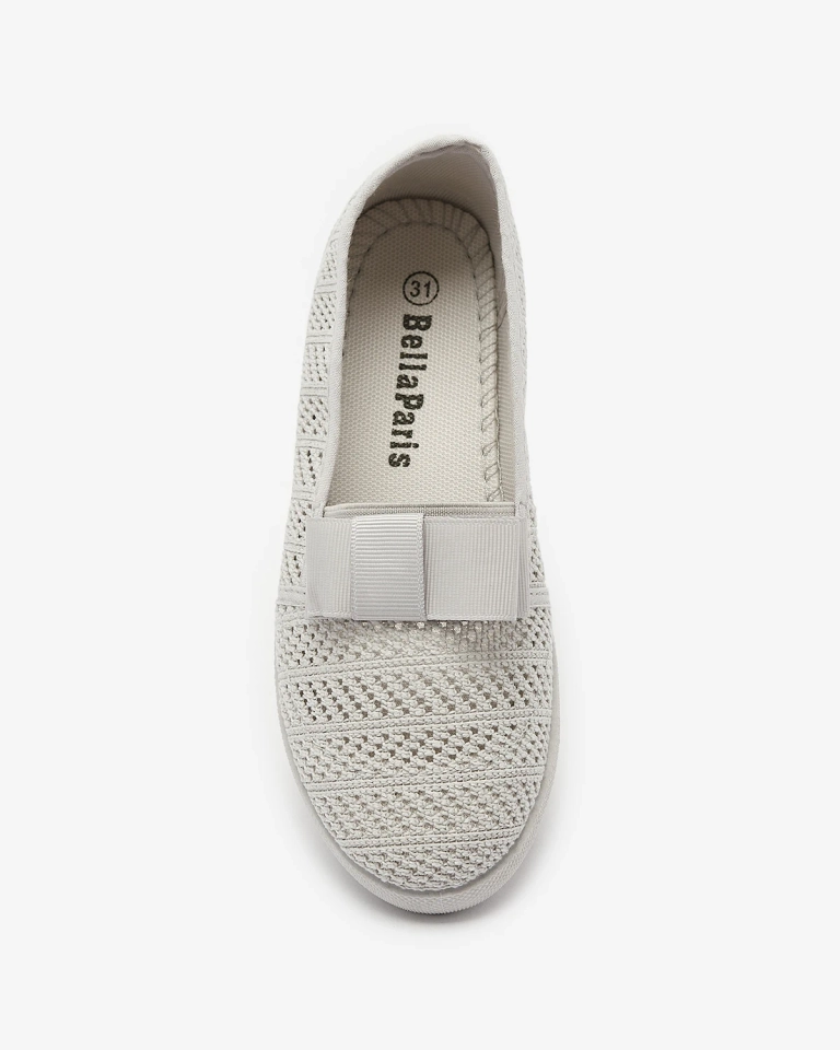 - Beautiful girls' slip on sneakers. The upper is made of openwork fabric material, the insole is also fabric. The pair is decorated with an adorable bow on the front. In addition, the shoes have a rubber insert for easy sliding of the foot into the shoe.