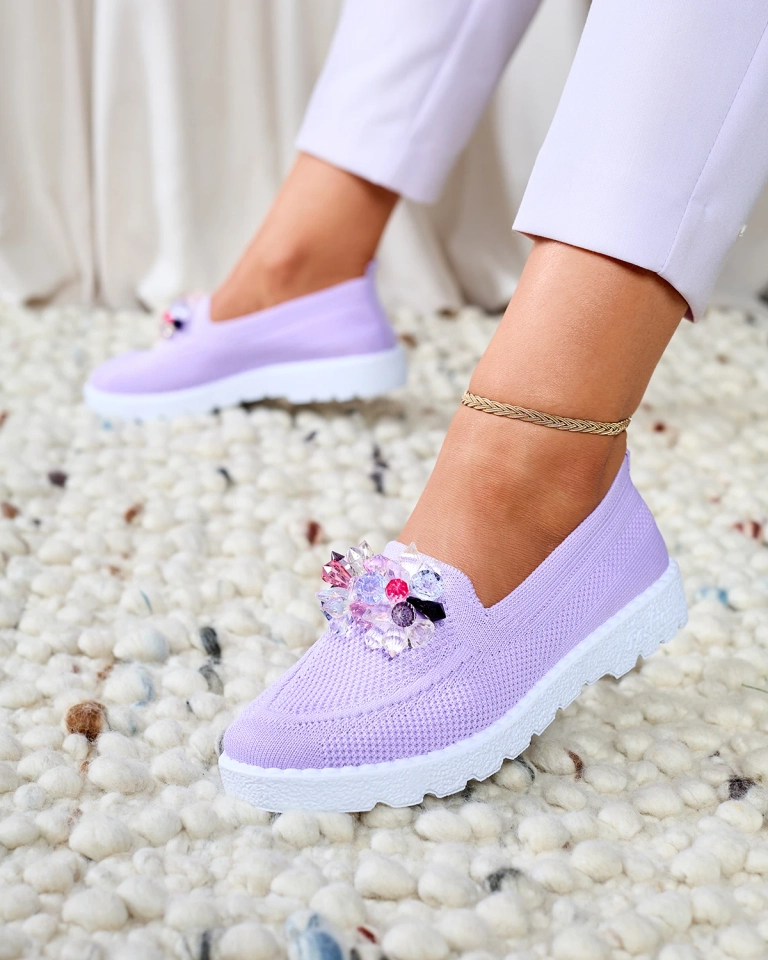 • Tasteful women's slip on sports shoes decorated with crystals, made of elastic fabric material. The middle is also lined with fabric.