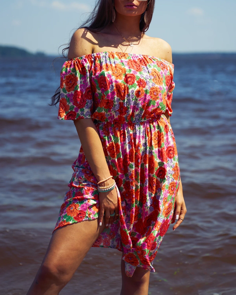 - Delicate women's mini length dress decorated with floral print. Model with a hiszpana neckline with elastic at the shoulders and waist. The dress has short sleeves. Ideal for vacations! NOTE: Measurement accuracy (+/-) 1 cm.