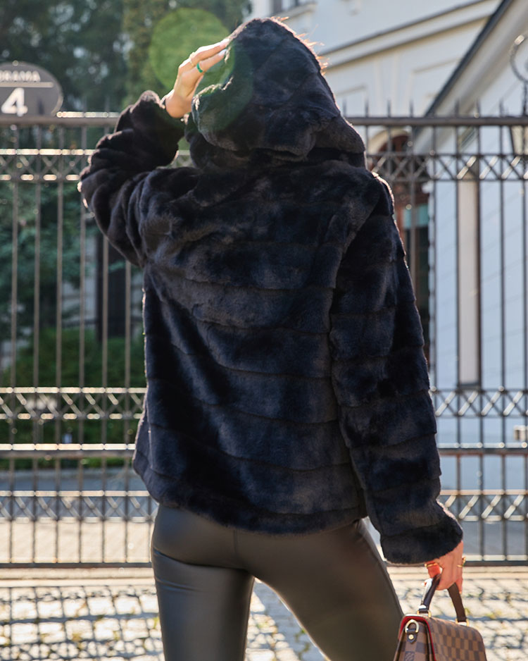 - Sensational women's jacket made of pleasant, soft material a'la fur. The model has a hood, 2 pockets and is zippered. A hit of this season!