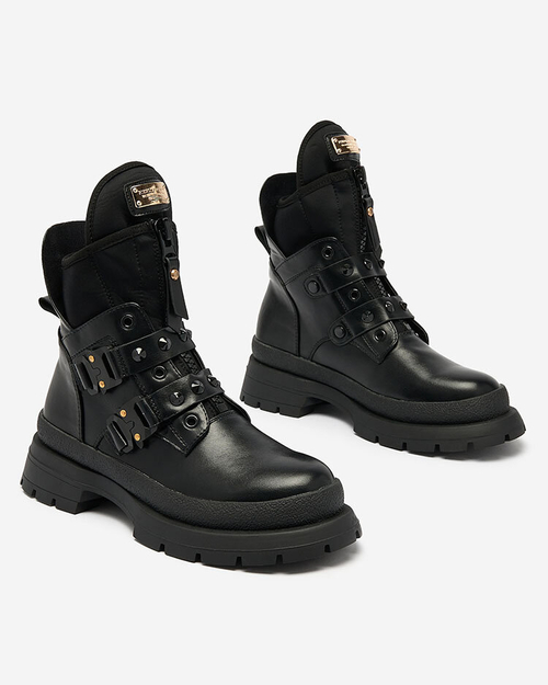 - Revelationally made bagger boots on a thicker sole. The upper is made of ecological leather, and inside there is a fabric insole. Model fastened with a zipper in front. Footwear decorated with studded buckles. Ideal for creating autumn styling!