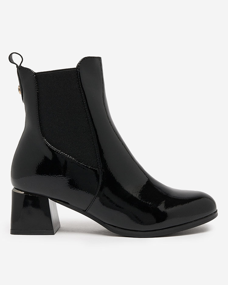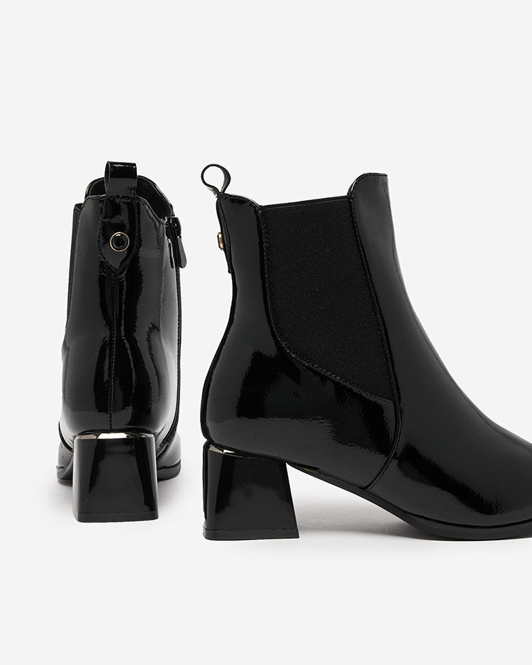 - Stylish women's boots on a low post. The upper is made of ecological patent leather, the interior is insulated with fur. The footwear is fastened with zippers on the sides. A great choice for autumn!