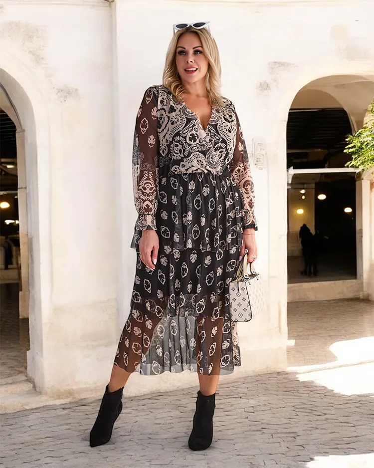- Women's midi dress with print made of transparent mesh-like material with lining. Model with long sleeves and sweetheart neckline with elastic at the waist. Perfect for everyday wear!