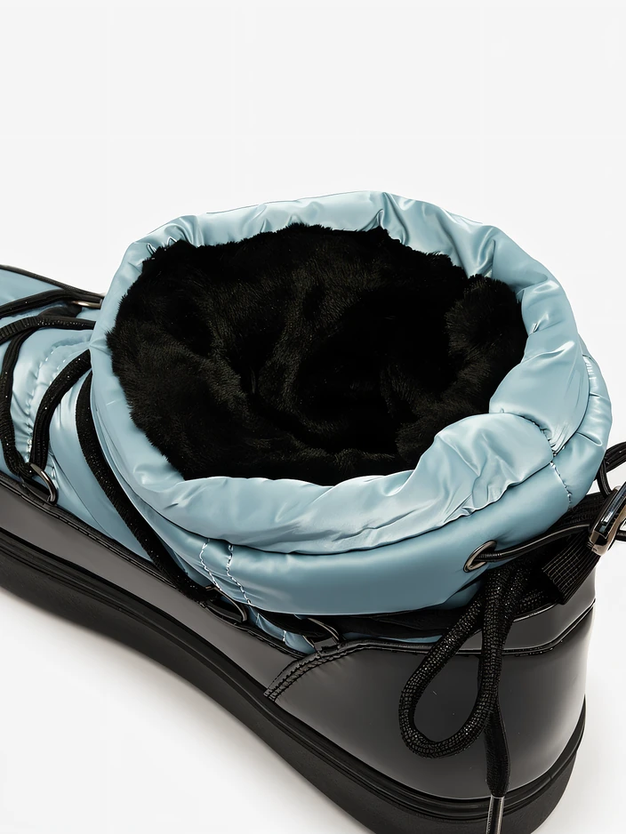 - Women's snow boots with an upper made of a combination of eco patent leather and a'la oilcloth material. Insulated inside in the form of fur, slip-on shoes. The model has a welt at the end of the upper. Ideal for winter!