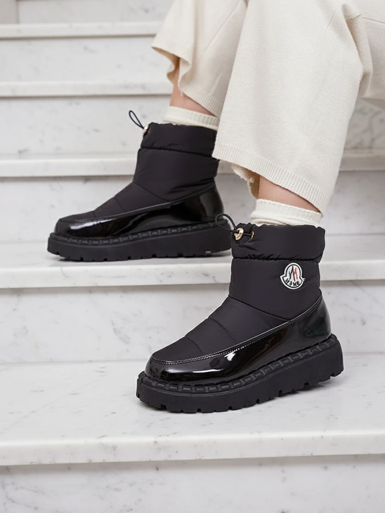 • Timeless women's slip-on snow boots. Model upper made of a'la oilcloth material and inserts of lacquered eco-leather. Insulated inside in the form of fur, the shoes slide on and have a welt. Perfect for the colder season!