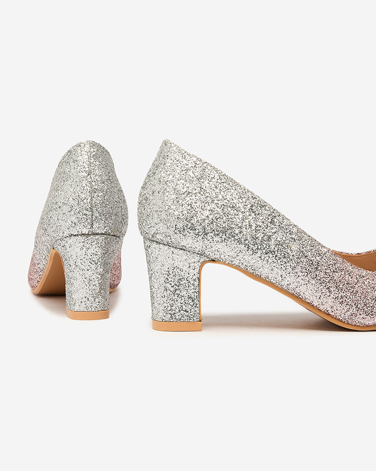 - Shiny women's stiletto pumps, made of eco-friendly leather. Rounded nose. Model decorated with a shiny layer of glitter adding charm. They will be a great decoration for evening styling!
