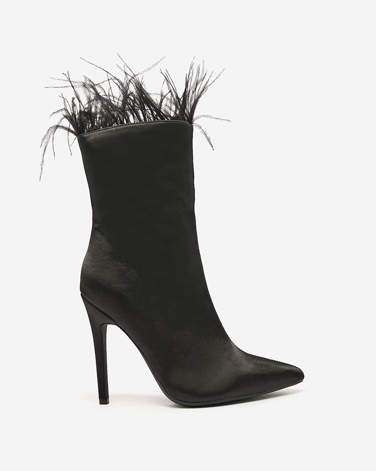 • Elegant stiletto heeled boots made of fabric a'la satin. The nose ended in a pointed tip. On the side zipper and decoration in the form of feathers at the end of the upper. Great shoes for autumn creations!