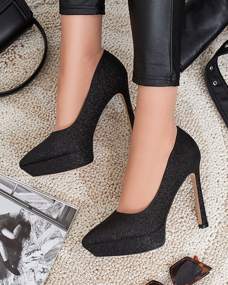 - Sensational women's pumps on a post, have an upper made of eco leather with glitter. The insole is lined with ecological leather, the model on a higher post with a pointed nose. Perfect for short dresses!