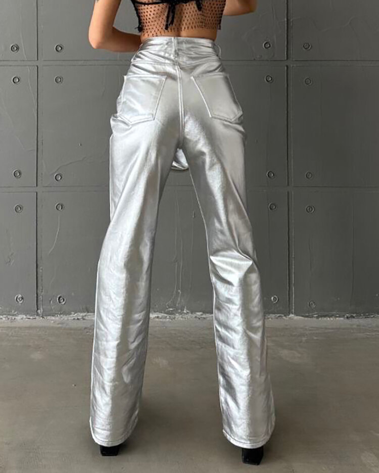 - Women's wide high-waisted pants with zipper and button closure. They have 4 slip pockets. All finished with a metallic effect. NOTE: Measurement accuracy (+/-) 1 cm.