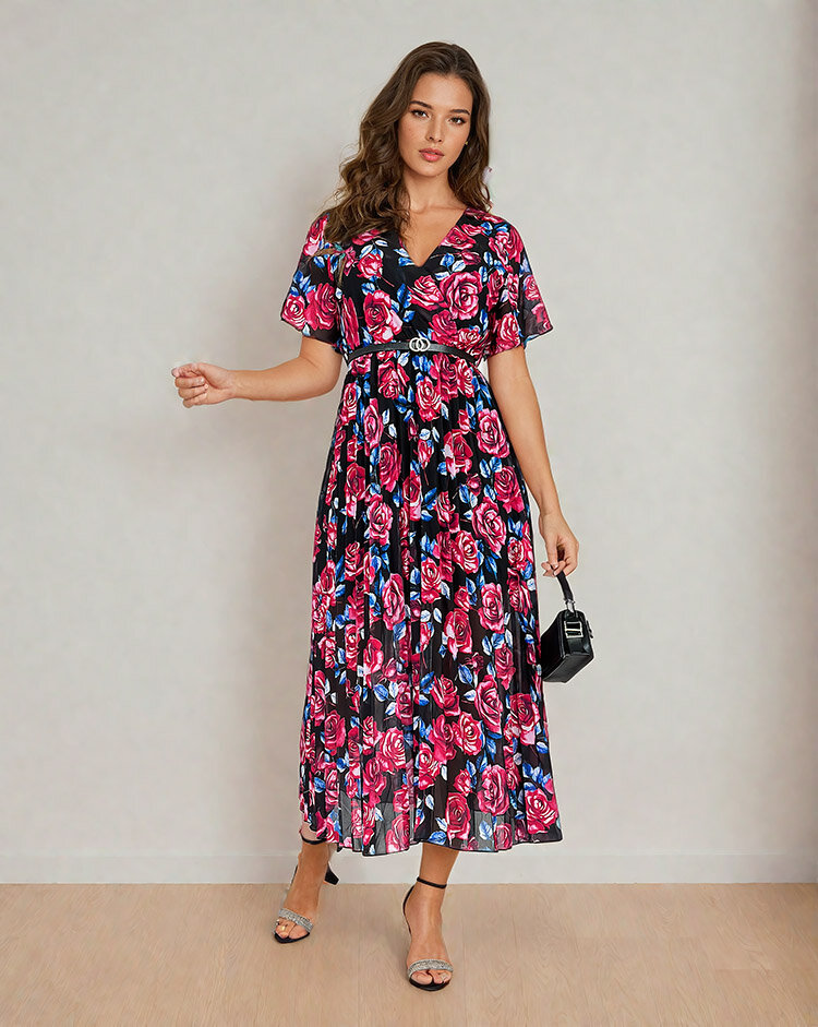 - A unique women's dress made of lightweight fabric with a floral pattern. At the height of the waist it has an elastic band. The product is midi length, has short sleeves and pleated trim. In addition, a belt is included. Feel the summer in this model!
