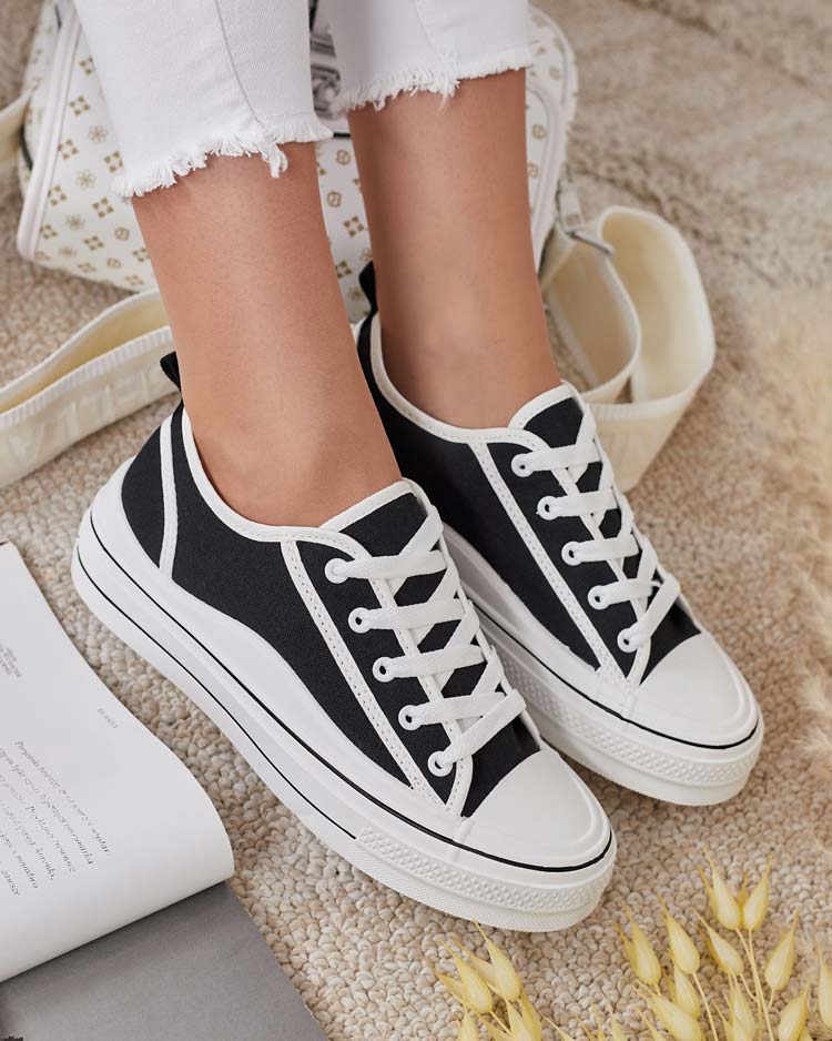 - Stylish women's sports sneakers made of fabric material. The model on a comfortable platform. The upper is laced. Great for creating casual outfits!
