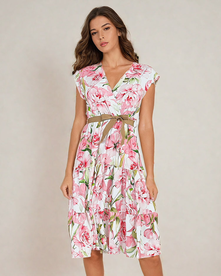 - A unique women's dress made of lightweight fabric with a floral pattern. At the height of the waist it has a belt. The product is midi length, has short sleeves and is finished with a frill. Feel the summer in this model!