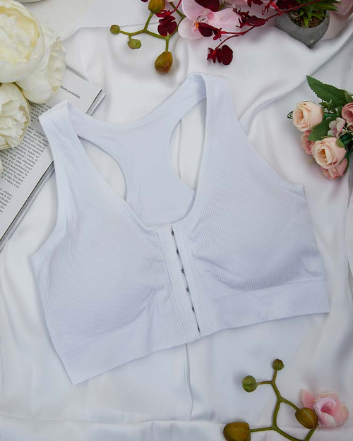 - Women's sports bra made of elastic, pleasant material. Model with non-adjustable, linked straps, with hook-and-loop fastening at the front, finished with wide elastic at the bottom. It will perfectly fit the body.