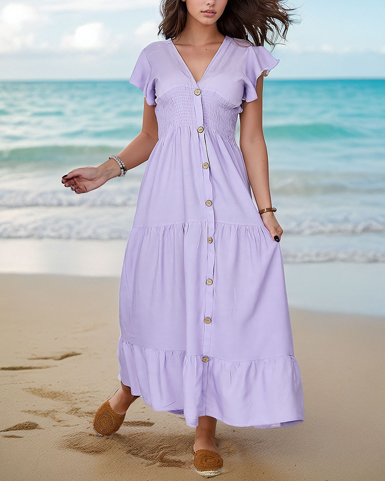 • Women's midi dress, with short sleeves and V neckline. Additionally decorated with buttons. Must have of this season! NOTE: Measurement accuracy (+/-) 1 cm. Dimensions measured flat.