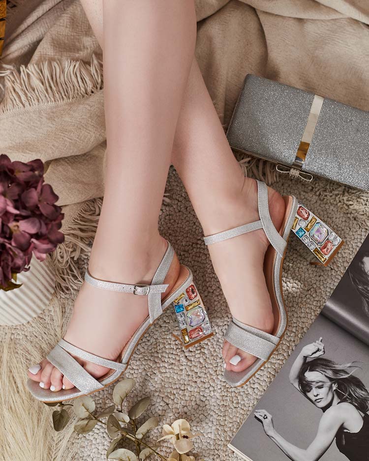 - Fabric-covered sandals with glitter on a high post with rhinestones, fastened with a buckle. Eco leather insole. A mix of style and comfort. Solid heel gives confidence to the step. Perfect for any occasion!