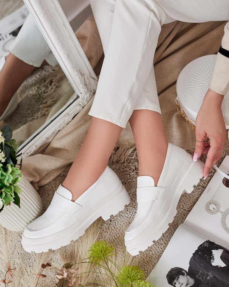 Platform moccasins are one of the hottest trends of recent seasons. They combine classic elegance with a modern, slightly androgynous style. White footwear is a hit for spring and summer, adding freshness and lightness to every outfit. The Aura model perfectly fits into the "comfort-first" fashion trend, where comfort goes hand in hand with sophisticated design. It is an ideal choice for women who want to follow trends without sacrificing practicality.