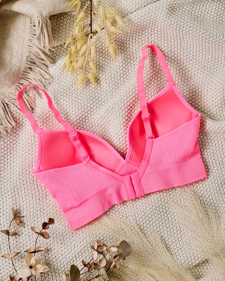 • Stiffened women's bra made of elastic, ribbed material. Model with adjustable straps and with non-removable inserts, finished with elastic at the bottom. It will perfectly fit the body.