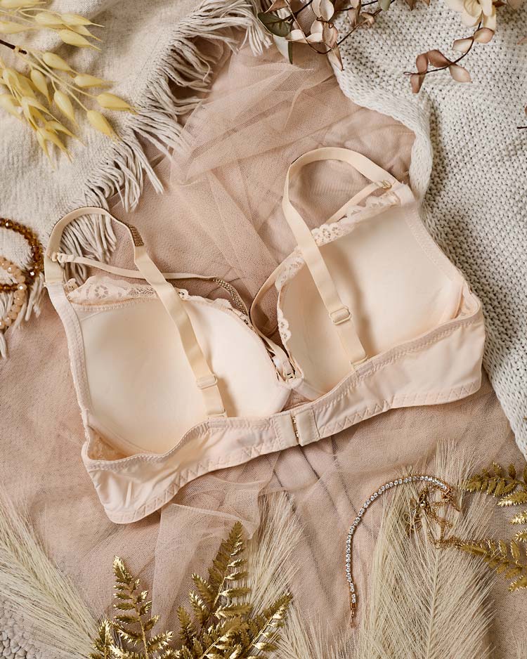 - Exceptional women's padded bra. Subtle finishes with delicate lace add to its elegance. The product is fastened at the back with hooks. The straps are detachable and adjustable. The model has decorative straps with zircons.