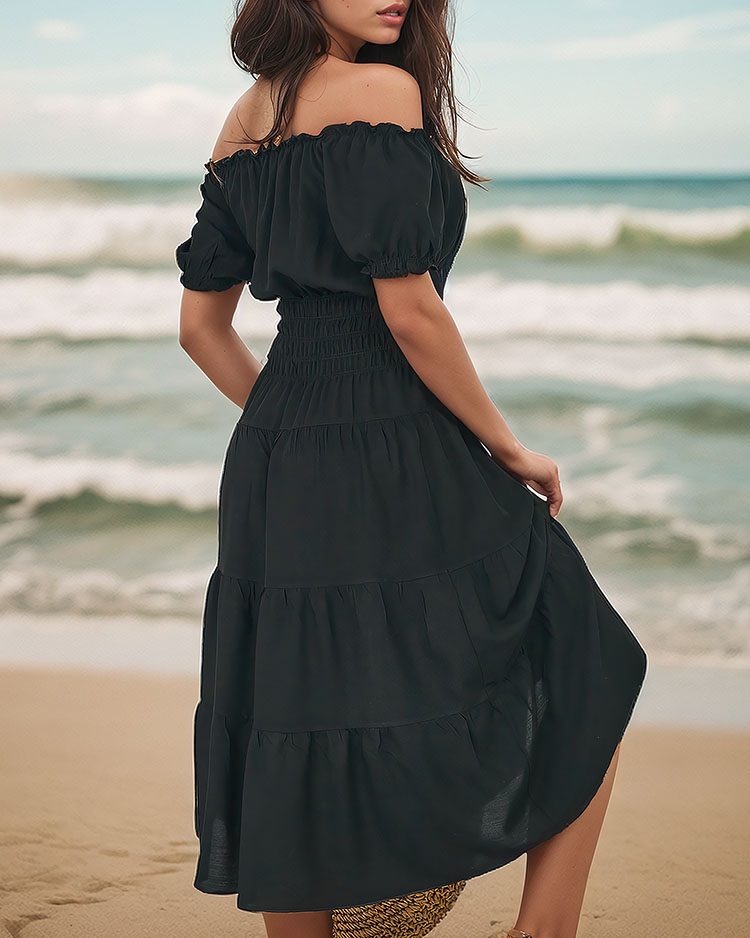 - Women's a'la Spanish dress made of lightweight fabric. At the height of the waist it has an elastic band. Knee-length product, has short sleeves and elastic at the neckline. Feel the summer in this model!