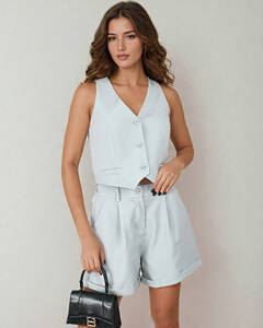 - Elegant women's set made of pleasant material. Short vest without sleeves buttoned. Short pants with elastic waistband and 2 pockets. Style and comfort in one!
