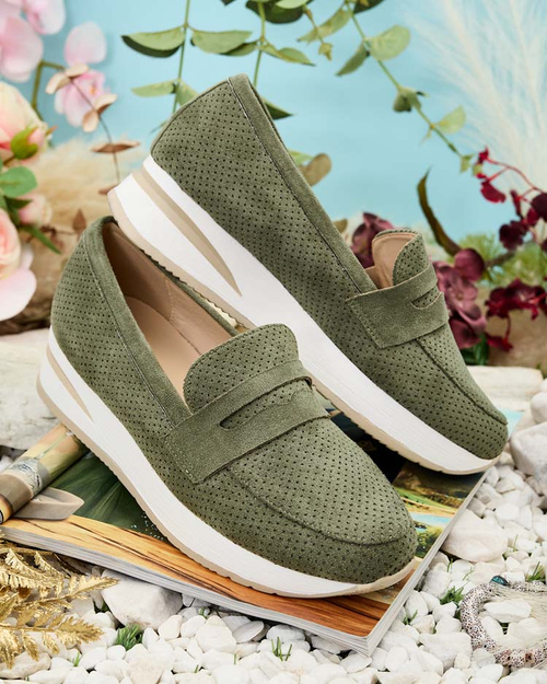 - Beautiful women's low-heeled moccasin half shoes. Model in a casual style and is made of organic suede leather and natural leather insole. Rounded nose. Perfect base for many everyday looks!