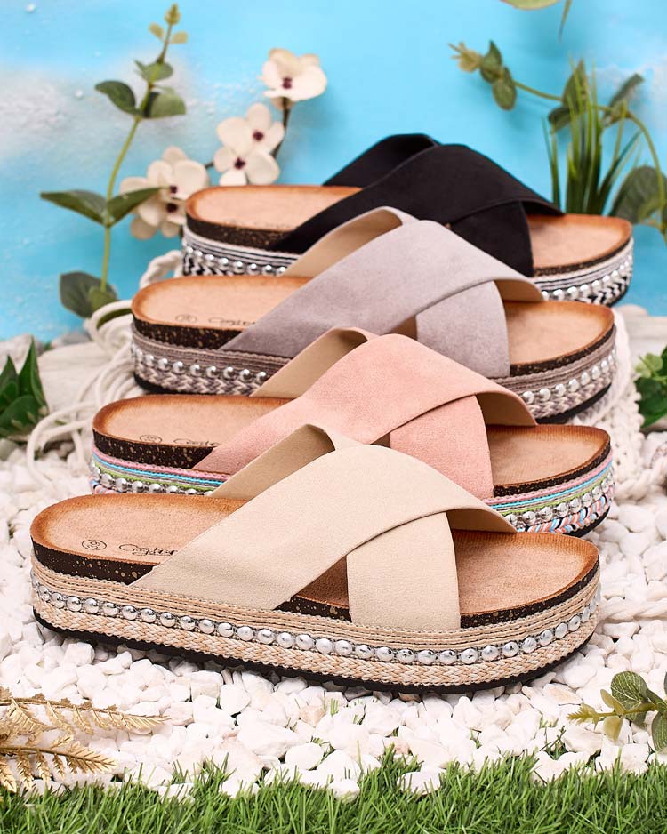 • Great women's flip-flops on a flat sole. Made entirely of eco suede leather. The sole decorated with material a'la cork. A perfect choice for the vacations!