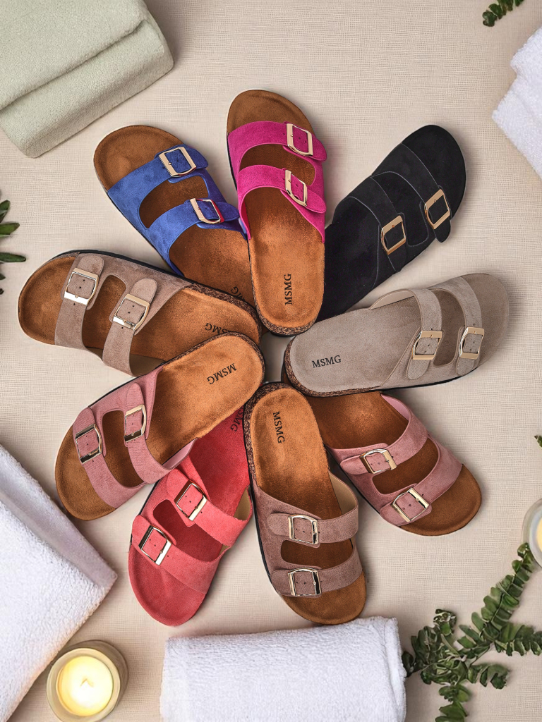 - Beautiful women's flip-flops made of ecological suede leather, decorated with plastic buckles. Rubber sole decorated with material a'la cork. Model in an interesting color scheme. Perfectly complement summer stylizations!