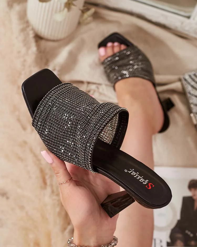 - Original heelless stiletto sandals made of sequin upper and eco leather insole. A combination of style and comfort. The post gives subtle elegance. Perfect for evening outings!